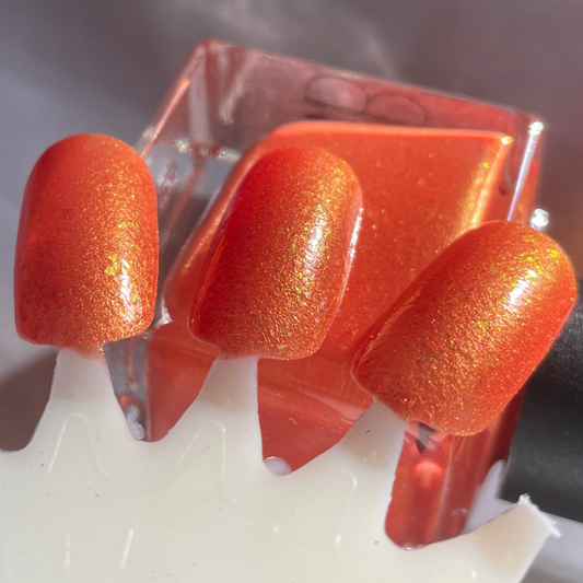 I received this polish to guest swatch, this is my unsolicited, voluntary review. I have to say I don’t normally like hex glitter, nor do I typically reach for oranges and yellows, but this was packed SO FULL of different glitters and such an intense, saturated orange and yellow thermal, that I found myself loving it despite myself. I did use a glitter smoother and two coats of topcoat because I hate texture, but the polish itself wore well for the whole week I had it on and the glow in the dark bonus was super fun. So if you like thermals, glow in the dark, glitter (LOADS of glitter), orange, yellow, any or all of the above, you’ll like this polish, too.